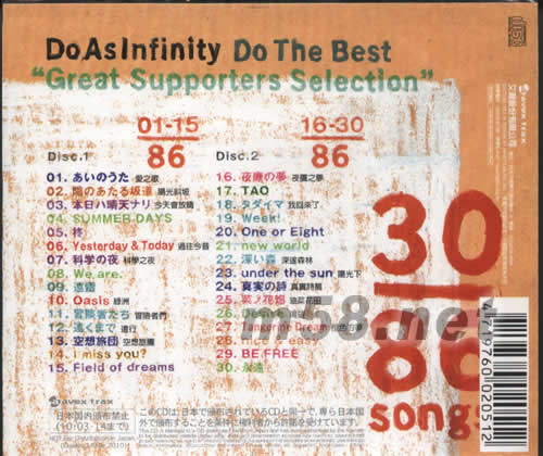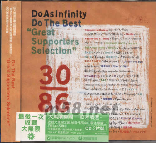價格為估,以實到貨為準! 無限完美“歌迷精選”(m58.net) 由歌迷從大無限樂團86首歌曲中票選出來的前30名之精選輯「Do As Infinity Do The Best Supporters Selection 無限完美 "歌迷精選"」2CD作品?!复鬅o限樂團 -最后演唱會-」雙DVD全長191分鐘,無中文字幕,附談話內容之中文翻譯、中文字幕版三VCD同時推出!「大無限樂團 -最后演唱會-」現場演唱3CD作品同時熱賣中!