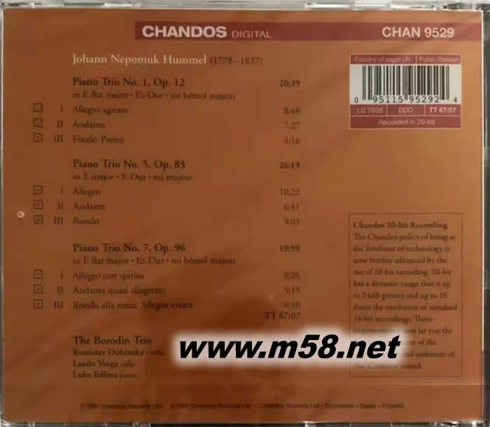 包羅丁三重奏 胡梅爾 HUMMEL PIANO TRIOS 1,5&7 (鋼琴、小提琴、大提琴)專輯背面圖片