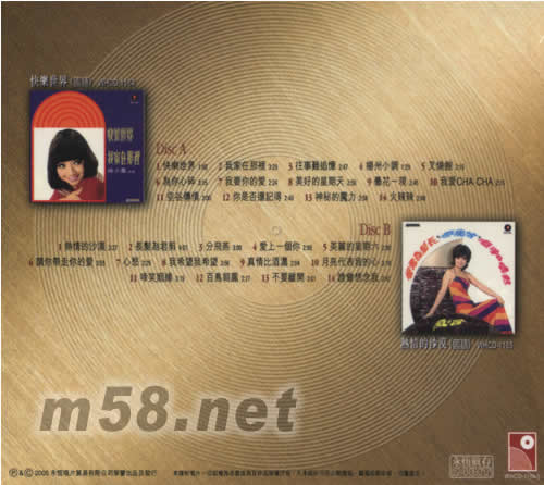 Disc A 01. 快樂世界 02. 我家在那里 03. 往事難追憶 04. 揚州小調 05. 叉燒飽 06. 為你心碎 07. 我要你的愛 08. 美好的星期天 09. 曇花一現 10. 我愛CHA CHA 11. 空谷傳情 12. 你是否還記得 13. 神秘的魔力 14. 火辣辣 Disc B 01. 熱情的沙漠 02. 長發為君剪 03. 分飛燕 04. 愛上一個你 05. 美麗的星期六 06. 請你帶走你的愛 07. 心愁 08. 我希望我希望 09. 真情比酒濃 10. 月亮代表我的心 11. 啼笑姻緣 12. 百鳥朝鳳 13. 不要離開 14. 誰會想念我