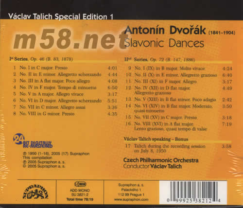 1 No.I in C major.Presto 2 No.II in E minor Allegretto scherzando 3 NO.III in A flat major Poco allegro 4 NO.IV in F major Tempo di minuetto 5 NO.V in A major Allegro vivace 6 NO.VI in D major Allegretto scherzando 7 NO.VII in C minor Allegro assai 8 NO.VIII in G minor Presto 9 NO.I(XI) in B major Molto vivace 10 NO.II(X) in E minor Allegretto grazioso 11 NO.III(XI) in F major Allegro 12 NO.IV(XII) in D flat major Allegretto grazioso 13 NO.V(XII) in B flat minor Poco adagio 14 NO.VI(XIV) in B flat major.Moderato quasi minuetto 15 NO.VII(XV) in C major Presto 16 NO.VIII(XVI) in A flat major Lento graxioso,quasi tempo di vales Vaclav Talich speaking-Bonus 17 Talich during the recording session on July 8,1950