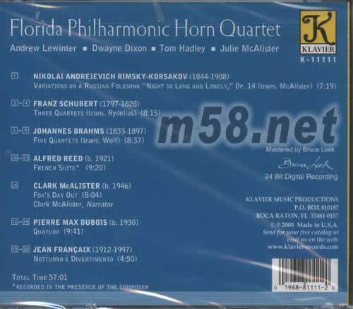 1.nikolai andreievich rimsky-korsakov(1884-1908) variations on a russian folksong night so long and lonely op.14(trans.mcalister) 2-4.franz schubert(1797-1828) three quartets(trans.rydelius) 5-9.johannes brahms(1833-1897) 10.13.alfred reed(b.1921) french suite* 14.clark mcalister(b.1946) foc's day out clark mcaister,narrator 15-18.poerre max dubois(b.1930 quatuor 19-20.jean francaix(1912-1997) notturno e divertimento