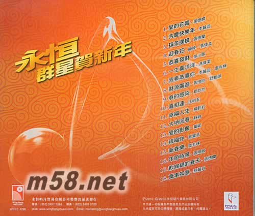 01. 愛的花蕾 -葉德嫻 02. 共慶歡樂年 -李麗蕊 03. 采茶撲蝶 -張德蘭 04. 迎春花 -靜婷 張偉文 05. 恭喜發(fā)財 -徐小鳳 06. 一生喜洋洋 -馮偉棠 07. 我要恭喜你 -李麗蕊 雷有暉 08. 財源廣進 -黃愷欣 舒雅頌 09. 春的感染 -夏妙然 10. 喜相逢 -汪明荃 11. 幸福人生 -柳影紅 12. 大地回春 -靜婷 13. 愛的影像 -薰妮 14. 祝福你 -景黛音 15. 新春樂 -雷有暉 16. 年節(jié)時景 -張明敏 17. 軟綿綿的春天 -張德蘭 18. 萬事如意 -蔡麗貞