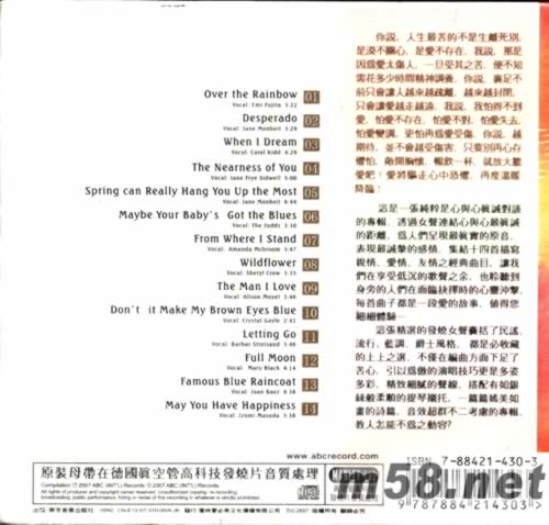 GOLDEN LIPS 極致立體聲七號金唇(m58.net) 你說,人生最苦的不是生離死別,是漠不關心,是愛不存在。我說,那是因為愛太傷人,一旦受其之苦,便不知需花多少時間精神調養。你說,裹足不前只會讓人越來越疏離,越來越封閉,只會讓愛越走越遠。我說,我怕得不到愛,怕愛不存在,怕愛不對,怕愛失去,怕愛變調,更怕再為愛受傷。你說,越期待,并不會越受傷害。只要別再心存懼怕,敞開胸懷,暢飲一杯,就放大膽愛吧!愛將驅走心中恐懼,再度溫暖降臨! 這是一張純粹是心與心真誠對談的專輯。透過女聲連結心與心最真誠的距離,為人們呈現最真實的原音,表現最誠摯的感情。集結十四首描寫親情、愛情、友情之經典曲目,讓我們在享受低沉的歌聲之餘,也聆聽到身旁的人們在面臨抉擇時的心靈沖擊。每首曲子都是一段愛的故事,值得您細細體驗… 這張精選的發燒女聲囊括了民謠、流行、藍調、爵士風格, 都是必收藏的上上之選。不僅在編曲方面下足了苦心,引以為傲的演唱技巧更是多姿多彩,精緻細膩的聲線、搭配有如銀絲般柔順的提琴襯托,一篇篇嫣美如畫的詩篇,音效超群不二考慮的專輯,教人怎能不為之動容?