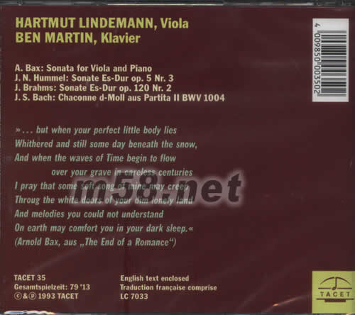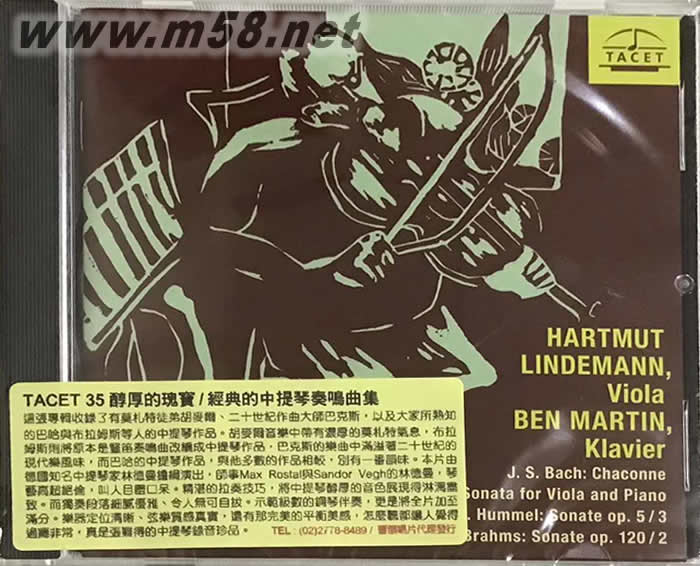 A.BAX:SONATA FOR VIOLA AND PIANO醇厚的瑰寶 經典的中提琴奏鳴曲(m58.net) 中提琴家林德曼(Hartmut Lindemann)1953年7月4日生于西德,林德曼為TACET推出一系列以中提琴演奏為主軸的專輯唱片,在樂界奠定了不可動搖的權威地位。 醇厚的瑰寶 - 經典的中提琴奏鳴曲集 長久以來,中提琴在管絃樂團里,似乎一直活在小提琴的陰影下。早在十七世紀就已經出現許多小提琴獨奏作品,但這段期間只有莫札特寫了首有名的「小提琴與中提琴交響協奏曲,K364」,但這位音樂神童也從未寫過中提琴獨奏作品。但懂得欣賞古典音樂的朋友都知道,其實中提琴醇厚的音色,獨奏起來別具優雅風味,細細品味令人愛不釋手。這張專輯收錄了有莫札特徒弟胡麥爾、二十世紀作曲大師巴克斯,以及大家所熟知的巴哈與布拉姆斯等人的中提琴作品。胡麥爾音樂中帶有濃厚的莫札特氣息,布拉姆斯則將原本是豎笛奏鳴曲改編成中提琴作品,巴克斯的樂曲中滿溢著二十世紀的現代樂風味,而巴哈的中提琴作品,與他多數的作品相較,別有一番韻味。本片由德國知名中提琴家林德曼擔綱演出,1953生於西德的他,1979年完成柯隆音樂院的學業,1982年后他移民澳洲加入塔斯馬尼亞(Tasmanian)交響樂團,1983年獲邀參與阿德雷德(Adelaide)音樂節,1989年他成為雪梨交響樂團客座中提琴手,同時參與澳洲室內管絃樂團的演出,他的首張錄音「The Virtuoso Viola,Tacet 21」發行於1991年。師事Max Rostal與Sandor Vegh的林德曼,琴藝高超絕倫,叫人目瞪口呆。精湛的拉奏技巧,將中提琴醇厚的音色展現得淋漓盡致。片中擔任鋼琴伴奏的是來自澳州墨爾本的班馬汀(Ben Martin)1970年出生於音樂世家,父親是指揮兼中提琴家,母親是大提琴家,連祖父都是位杰出的鋼琴家。他八歲開始學鋼琴,十一歲師事吉利爾斯(Emil Gilels)的徒弟Alexander Semetsky,之后又與米開朗杰里(Arturo Benedetti Michelangeli)的徒弟Stephen Mclntyre學習,等於是吉利爾斯與米開朗杰里的徒孫。到紐約之后進入茱利亞音樂院拜入John Browning門下,1991年他更贏得曼紐因大賽首獎。本片從頭到尾精彩絕倫,令人難以喘息,獨奏段落細膩優雅、讓人無可自拔。而示范級數的鋼琴伴奏,更是將全片加至滿分。全碟樂器定位清晰、弦樂質感真實,還有那完美的平衡美感,怎么聽都讓人覺得過癮非常,真是張難得的中提琴錄音珍品。