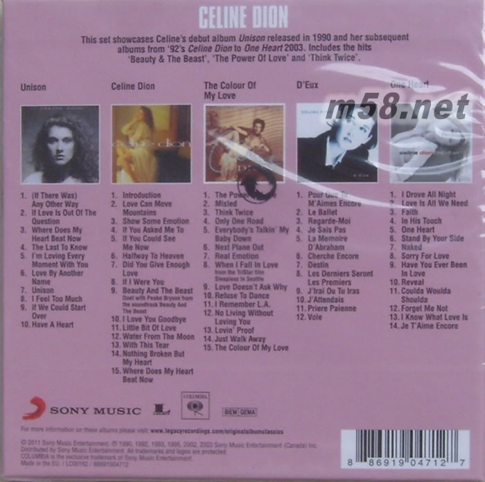 Original Album Classics 經(jīng)典專輯全集5CD套裝(m58.net) ★紀(jì)錄第一! 5座葛萊美獎(jiǎng)、2座奧斯卡、「史上銷售最佳女性流行藝人」、「?jìng)髌嫠嚾恕勾螵?jiǎng)… ★銷售第一! 2億張唱片銷售、19張冠軍作品 ★情歌第一! 出道30年擁有42首冠軍單曲 ★首次集結(jié)5張暢銷千萬(wàn)個(gè)人專輯: Unison、Celine Dion、The Colour Of My Love、D’Eux、One Heart全球限量盒裝珍藏發(fā)行