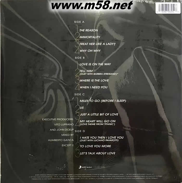 SIDE 1 LP 1. Side A The Reason 2. Immortality 3. Treat Her Like a Lady 4. Why Oh Why 5. Side B Love Is On The Way 6. Tell Him (Duet with Barbra Streisand) 7. Where Is The Love 8. When I Need You SIDE 2 LP 1. Side A Miles To Go (Before I Sleep) 2. Us 3. Just A Little Bit Of Love 4. My Heart Will Go On (Love Theme from 5. Side B I Hate You Then I Love You (Duet with Luciano Pavarotti) 6. To Love You More (featuring Taro Hakase on violin) 7. Let`s Talk About Love