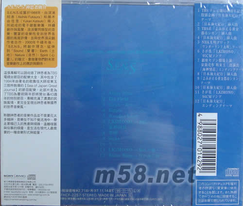 藍色心情(日本版)(m58.net) S.E.N.S成團於1988年,由深浦昭彥(Akihiki Fukaura)和勝木由佳里(Yukari Katsuki)兩人所組成的電子鍵盤樂團,持續創作與風聲、波浪聲同類型的音樂。豐富的音樂性受到世界各國的高度評價,并與世界頂尖創作者合作。2000年千禧年后,「S.E.N.S」將創作理念,延伸到「Sound(聲響),Earth(土地),Nature(自然),Spirit(心靈)」的層次,象徵著他們對未來音樂創作上的應許與期待。 這張專輯可以說收不了神思者為TBS電視臺節目的配樂大全,其中包含了1994年由著名的歌舞技大師坂東玉三郎所執尋的[sea of japan great journal]的節目擊者配樂,此部片是為了TBS為度祝隔年即將開臺滿40周年的特別兇目,專輯充滿濃濃的民族風情,更完全呈現也神思者無國界的世界音樂風. 聆聽神思者的音樂作品并不需要花太多精神,音樂在不知不覺流浪中,帶走累積已久的焦慮與煩惱,遠離喧囂與谷事煩惱,是生活在現代人最需要的一種音樂形式與能量.