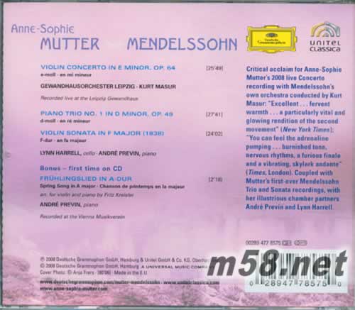 孟德爾頌:小提琴協奏曲、第一號鋼琴三重奏、F大調小提琴奏鳴曲、春之聲MENDELSSOH:VLN CTO(古典愛好者必備)(m58.net) 慕特在八○年代初期就與卡拉揚與柏林愛樂錄制過孟德爾頌小提琴協奏曲,時隔二十多年,慕特前往萊比錫,與首演這部小提琴協奏曲,並且與孟德爾頌有12年合作情誼的布商大廈管弦樂團合作,由曾經帶領該團長達26年的馬舒擔任指揮。慕特形容,與馬舒合作「就像在空中飛行一般」,這正是慕特詮釋孟德爾頌時最想要的感受;樂團的聲音清晰透明而且高貴典雅,音樂家們對於音樂內在平衡性的重要性也瞭如指掌,「與他們合作並不是一同演奏,而是一起感受音樂並且呼吸」慕特說。 F大調小提琴奏鳴曲與小提琴協奏曲都是孟德爾頌為費迪南‧大衛創作的作品,除了首尾兩個熱情的樂章,小提琴與鋼琴在慢板樂章的對話相當迷人。由於孟德爾頌工作忙碌,雖然這部奏鳴曲沒有經過最后修訂,樂譜直到1953年才由曼紐因修訂出版,但是慕特認為它的杰出程度不亞於有著同樣命運的《義大利》交響曲。 第一號鋼琴三重奏在孟德爾頌生前就受到高度重視,是一部強調音樂家彼此心靈感受,而非單純的聲音間對比的作品。普列文、哈瑞爾對於音樂的理念與慕特相通,除了各自保有聲部的自發性與多樣化的色彩,同時也兼顧到相互信任又能傾聽對方。