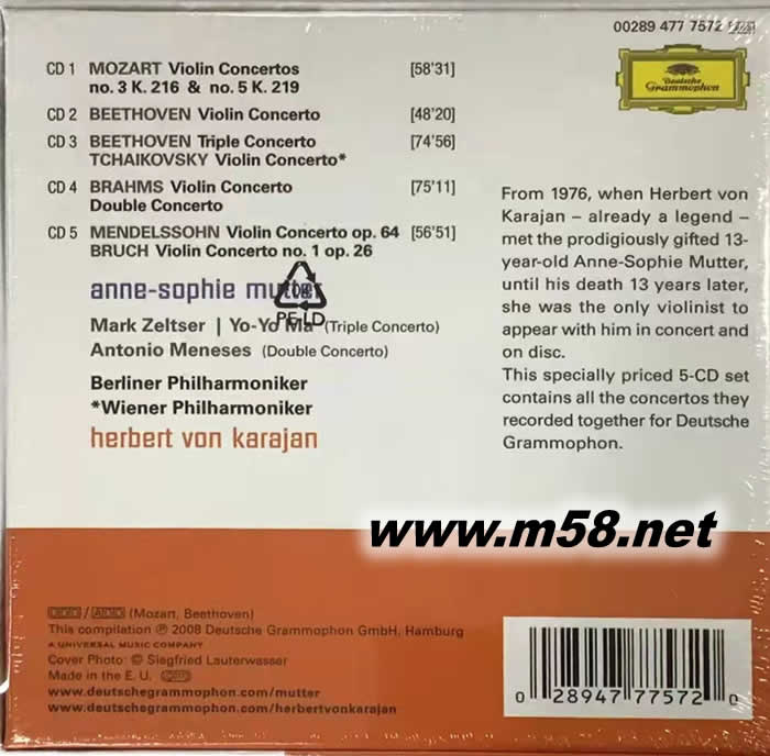 卡拉揚與慕特 合作錄音全輯 Complete Recordings On Deutsche Grammophon 1978-1988 5CD套裝(m58.net) 這套5CD的《在DG公司的錄音全集》由DG唱片公司發行于2008年,小提琴家安妮-索菲?穆特擔任主奏,赫伯特?馮?卡拉揚指揮樂團演奏錄制。這一系列錄音在2008年“卡拉揚年”來臨之際得以再版發行,價格定位更超值。 安妮-索菲?穆特出生于德國,13歲獲指揮大師卡拉揚賞識并被邀與之合作,被其稱為“自梅紐因以來最偉大的音樂天才”,之后安妮-索菲?穆特作為小提琴獨奏家和室內樂演奏家頻繁地在世界各地巡演。1990年她在倫敦和斯圖加特舉辦了安妮-索菲?穆特音樂節,從巴洛克時期到前衛音樂時期,多角度地展示了她的藝術才華。安妮-索菲?穆特多次參加薩爾茨堡音樂節等重要音樂節,并曾獲得兩項格萊美獎。安妮-索菲?穆特是一位典型的德奧血統的演奏家,性格熱情,具有嚴謹的思維邏輯和內在個性,這使她形成了優良的演奏素質和高品位的藝術修養,被喻為成當代小提琴界的“女梅紐因”。 赫伯特?馮?卡拉揚(Herbert von Karajan,1908-1989)是已故偉大的奧地利指揮家。他的指揮生涯先從小城烏爾姆開始,1938年被聘為柏林歌劇院的指揮,1947年任維也納愛樂樂團和維也納樂友協會管弦樂隊指揮,1949年起兼任米蘭斯卡拉歌劇院常任指揮,1950年兼任倫敦愛樂樂團常任指揮,1955年起任柏林愛樂樂團的終身常任指揮,1956年任維也納國立歌劇院的音樂總指導。他是現代最著名的指揮家之一,人們稱他為“歐洲音樂的總指導”。卡拉揚有驚人的指揮技巧,與樂隊的配合如水乳交融般天衣無縫,通過熱情洋溢、奔放豪邁的演奏,將音樂準確而強有力地傳達給聽眾。卡拉揚一生共指揮錄制了650多種唱片,僅錄制貝多芬全部交響曲的唱片,就有7000多萬張。 卡拉揚的指揮充滿著精致而細膩的手法,他的指揮動作灑脫、大方、氣勢磅礴,并以準確和客觀著稱。在指揮臺上卡拉揚經常閉目深思,使得樂隊各聲部之間達到了演奏室內樂般的默契。在他的領導下,柏林愛樂樂團展現出了一種有如金屬般的亮色,被譽為卡拉揚“音響”。 卡拉揚指揮時不僅自己全身心投入音樂之中,而且還善于啟發樂隊隊員,使他們懂得如何演奏,用魔法般的動作牢牢吸引住樂隊。他所追求的目標就是,“把托斯卡尼尼的精確與富爾特文格勒的幻想結合在一起”。正是他的音樂天賦,加上對樂曲的正確理解和對樂隊的嚴格要求,他的演出總能達到超常出眾的藝術水平。