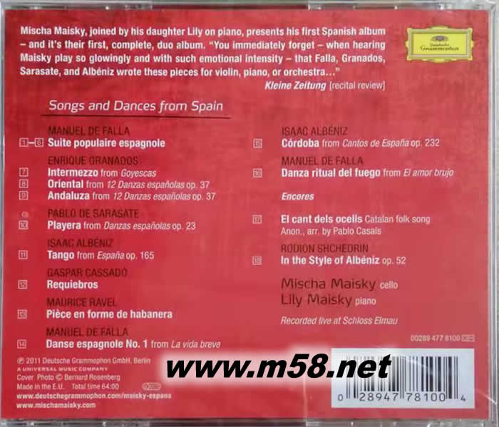 ESPANA ! 浪漫西班牙歌與舞(m58.net) 「我覺得與西班牙音樂非常親近,因為觀眾聽到音樂演奏總是充滿熱情!」--- 麥斯基 雖然本身的血統、成長環境與西班牙完全沒有關係,但是長久以來,麥斯基對於西班牙音樂的熱愛只是有增無減。他認為,西班牙音樂與自己的內心世界非常近似,因此除了在舞臺上演出西班牙作品,他也一直盼望能錄製一張西班牙音樂專輯。這張音樂會實況錄音為麥斯基圓了多年的夢想。這是麥斯基與24歲的長女,也就是鋼琴家莉莉‧麥斯基在德國的音樂會實況錄音。 由於西班牙作品,例如,法雅《西班牙流行歌曲組曲》原本就是歌曲,而大提琴又是與人聲十分相近的樂器,因此改由大提琴來詮釋這樂曲,絲毫沒有一點勉強的感覺。除了卡薩多、皮亞季格爾斯基等人的改編,麥斯基也親自參與改編數首作品,以捕捉原始音樂的氣質與情緒為最高準則。 值得一提的是,雖然麥斯基未能親炙卡薩爾斯這一位大提琴泰斗,但是在卡薩爾斯逝世前兩個月,兩人有幸在耶路撒冷長談。因此麥斯基特地在樂曲尾聲安排《白鳥之歌》向卡薩爾斯致敬