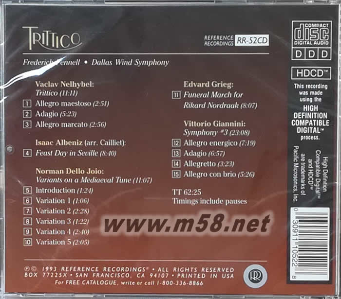 發燒三件頭 TRITTICO RENNELL DALLAS WIND SYMPHONY HDCD(m58.net) 《發燒老祖指揮》芬尼爾在《爆棚風琴》(RR-58CD)外,最受發燒樂迷推崇的一款錄音,五首現代派作品,在老祖棒下,達拉斯管樂交響樂團,發揮得淋漓盡致,熱情四瀉。 老祖奠定《發燒指揮》之作。該碟榮獲1993年最佳古典唱片大獎(NAIRD Indie Award)。
