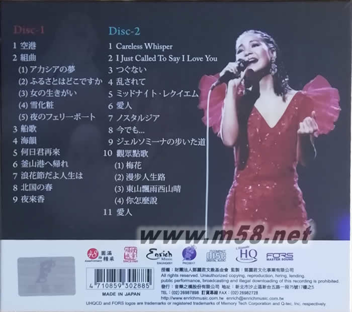 1. 船歌 2. 海韻 3. 何日君再來 4. 請回釜山港 5. 浪花曲啊 女人的一生 6. 北國之春 7. 夜來香 8. I Just Called To Say I Love You 9. 償還 10. 攪亂 11. 愛人 12. 依然 13. 杰露索迷娜走過的道路