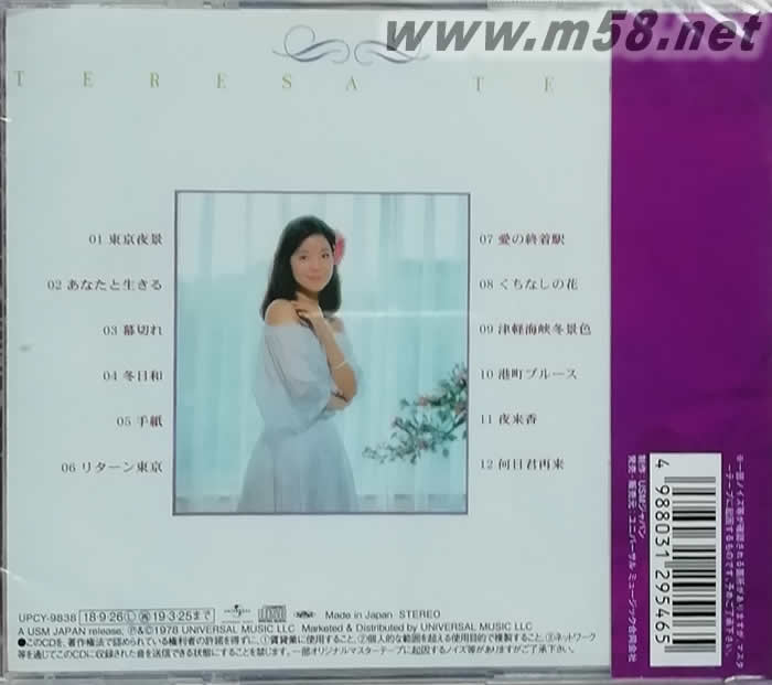 1. 東京夜景 (今天歡樂明天夢) 鄧麗君 play 2. あなたと生きる (你裝做不知道) 鄧麗君 play 3. 幕切れ 鄧麗君 play 4. 冬日和 鄧麗君 play 5. 手紙 (一封情書) 鄧麗君 play 6. ララバイ東京 (想起你) 鄧麗君 play 7. 愛の終著駅 (你在我夢裡) 鄧麗君 play 8. くちなしの花 (逍遙自在) 鄧麗君 play 9. 津軽海峽冬景色 (一片落葉) 鄧麗君 play 10. 港町ブルース (誰來愛我) 鄧麗君 play 11. 夜來香 (中國語) 鄧麗君 play 12. 何日君再來 (中國語) 鄧麗君