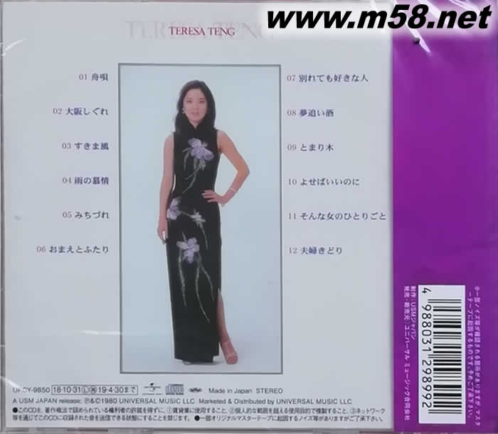 2018年秋季再版發行的 鄧麗君誕生65周年 2018日本限量版 系列單CD裝 一共18個品種: 1 東京夜景 (鄧麗君誕生65周年 2018日本限量版) CD UPCY9838 2 First Concert (鄧麗君誕生65周年 2018日本限量版) CD UPCY9836 3 故鄉在何方 (鄧麗君誕生65周年 2018日本限量版) CD UPCY9835 4 與你一起生活(鄧麗君誕生65周年 2018日本限量版) CD UPCY9837 5 心夜(鄧麗君誕生65周年 2018日本限量版) CD UPCY9839 6 愛人(鄧麗君誕生65周年 2018日本限量版) CD UPCY9856 7 旅人(鄧麗君誕生65周年 2018日本限量版) CD UPCY9853 8 步道(鄧麗君誕生65周年 2018日本限量版) CD UPCY9852 9 親愛的你 あなた/まごころ(鄧麗君誕生65周年 2018日本限量版) CD UPCY9859 10 演歌のメッセージ(鄧麗君誕生65周年 2018日本限量版) CD UPCY9832 11 夜之乗客 女の生きがい (鄧麗君誕生65周年 2018日本限量版) CD UPCY9832 12 償還(粉紅封面)(鄧麗君誕生65周年 2018日本限量版) CD UPCY9855 13 贖罪 つぐない(黃衣封面)(鄧麗君誕生65周年 2018日本限量版) CD UPCY9854 14 鄧麗君演唱會 CONCERT LIVE(鄧麗君誕生65周年 2018日本限量版) CD UPCY9857 15 酒醉的探戈 CONCERT LIVE(鄧麗君誕生65周年 2018日本限量版) CD UPCY9859 16 我只在乎你 CONCERT LIVE(鄧麗君誕生65周年 2018日本限量版) CD UPCY9858 17 別離之預感 CONCERT LIVE(鄧麗君誕生65周年 2018日本限量版) CD UPCY9860 18 洋槐之夢 (鄧麗君誕生65周年 2018日本限量版) CD UPCY9833