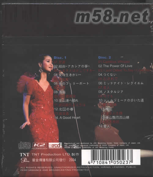 Disc 1 01. 空港 02. 組曲~ ァカシァの夢(mèng)~ 03. ふるさとはざこごすか~ 04. 女の生きがい~ 05. 雪化妝~ 06. 夜のフェリ一ボ一ト 07. 船歌 08. 海韻 09. 何日君再來(lái) 10. 釜山港ヘ歸れ 11. 浪花節(jié)だょ人生は 12. 北國(guó)の春 13. 夜來(lái)香 14. A Good Heart Disc 2 01. Careless Whisper 02. The Power Of Love 03. I Just Called To Say I Love You 04. つぐない 05. 亂されて 06. ミツドナィト.レクィェム 07. 愛(ài)人 08. ノスタルヅァ 09. 今でも... 10. ヅエルソミ一ナの步いた道 11. 觀眾點(diǎn)唱:(1)梅花/(2)漫步人生路/(3)東山飄雨西山晴/(4)你怎么說(shuō) 12. 愛(ài)人