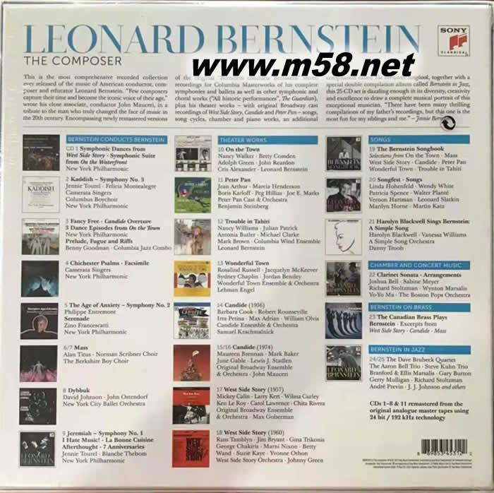 The Composer SYMPHONIES CONCERT THEATER WORKS BALLETS SONGS (25CD大套裝)(m58.net) 伯恩斯坦 Leonard Bernstein 音樂大師伯恩斯坦誕生100週年最佳獻(xiàn)禮。 伯恩斯坦堪稱是本世紀(jì)最偉大的指揮家、作曲家及鋼琴家。 伯恩斯坦的樂迷不可或缺的錄音,現(xiàn)代音樂愛好者必備的典藏。 2018年,將為1918年出生之音樂大師伯恩斯坦(Leonard Bernstein)100歲誕辰。為此,SONY唱片公司特別將旗下所擁有的伯恩斯坦創(chuàng)作樂曲之錄音,集合成這一套25CD專輯以示緬懷與紀(jì)念。 伯恩斯坦是集指揮家、作曲家、演奏家、教育家、理論家於一身的藝術(shù)大師,其藝術(shù)造詣舉世推崇,並堪稱是本世紀(jì)最偉大的指揮家、作曲家及鋼琴家。1918年8月25日出生於麻薩諸塞州的勞倫斯,而於1990年10月14日去世。其主要音樂教育完成於哈佛大學(xué),1939年畢業(yè)后,又在寇蒂斯音樂院隨萊納學(xué)習(xí)作曲,1940年在壇格塢伯克夏音樂中心向庫塞維茨基(Sergey Koussevitzky)學(xué)習(xí)指揮。 本紀(jì)念特輯收錄25張CD之曲目,並以黑膠唱片封套的尺寸作為包裝設(shè)計。收錄他所創(chuàng)作的交響曲、協(xié)奏曲、室內(nèi)樂、劇場作品、芭蕾與歌曲。其中部分作品還是由伯恩斯坦親自指揮與演奏。錄音母帶經(jīng)24 bit/192 kHz重新處理,完美重現(xiàn)當(dāng)年的錄音效果。 早在伯恩斯坦成為專業(yè)指揮前,就已經(jīng)以作曲家身分聞名樂壇,擔(dān)任指揮后亦有不少杰作。重要作品有音樂歌舞劇「西城故事」(West Side Story, 1961)、「錦城春色」(On The Town, 1944),歌劇「憨第德」(Candide, 1956),第1號交響曲「耶利米亞」(Jeremiah, 1942)、第2號「不安的年代」(The Age of Anxiety, 1949)、第3號「卡迪希」(Kaddish, 1963),以及小提琴獨(dú)奏、弦樂與打擊樂的「小夜曲」(Serenade, 1954),芭蕾舞劇「自由想像」(Fancy Free, 1944)等。 伯恩斯坦的部分作品兼具有爵士樂的明朗個性與古典樂的深思性格。雖然是兩種相衝突的元素,伯恩斯坦的作曲卻能將他們?nèi)诤贤踪N,彰顯了他高明的作曲功力。若將他的作品改編以爵士樂演奏也就順理成章。因而專輯中也收錄了兩張由多位爵士樂手演奏的錄音,包含了Dave Brubeck Quartet, Gary Burton, The Aaron Bell, Eldar Djangirov, J. J. Johnson, Branford Marsalis, Gerry Mulligan, André Previn, Martial Solal, Richard Stoltzman等人的演奏。 儘管伯恩斯坦在指揮上的成績有目共睹,然而這套專輯更表彰了他在作曲上的成就,不僅是伯恩斯坦的樂迷不可或缺的錄音,更是現(xiàn)代音樂愛好者必備的典藏。