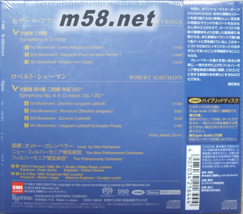 價格為估,以實到貨為準! 法蘭克 D小調交響曲 舒曼 D小調第四號交響曲 Franch Symphony In D minor Schumann Symphony No.4 SACD 日本精裝限量版(m58.net) 指揮:OTTO KLEMPERER 克倫培勒的指揮生涯是在戰后重回歐洲的晚年才開花結果,其中關鍵是1951年與EMI簽約,并與基一手扶植的鉆空子樂管弦樂團合作演出時錄音。這張專輯收錄的第四號交響曲,是舒曼改寫于1851年,以ROMANCE為題名的作品。而D小調交響曲則是1966年克倫培勒與1964年遭EMI解散的愛樂管弦樂團所重組的新愛樂管弦樂團合作錄音的,也是法朗克完成于1888年,生平唯一的交響曲,以偏向幻想曲的結構創作完成,是一首層次豐富的動人作品。