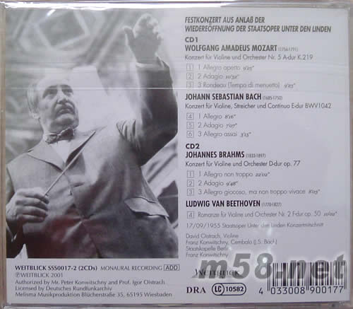 價格為估,以實到貨為準! 小提琴演奏莫扎特與貝多芬(m58.net) DAVID OISTRAKH(大衛·奧伊斯特拉赫)1908年生于前蘇聯,被諭為20世紀小提琴藝術世上永放異彩的超級巨星,他的演奏氣勢宏大,感情豪放,富有感染力