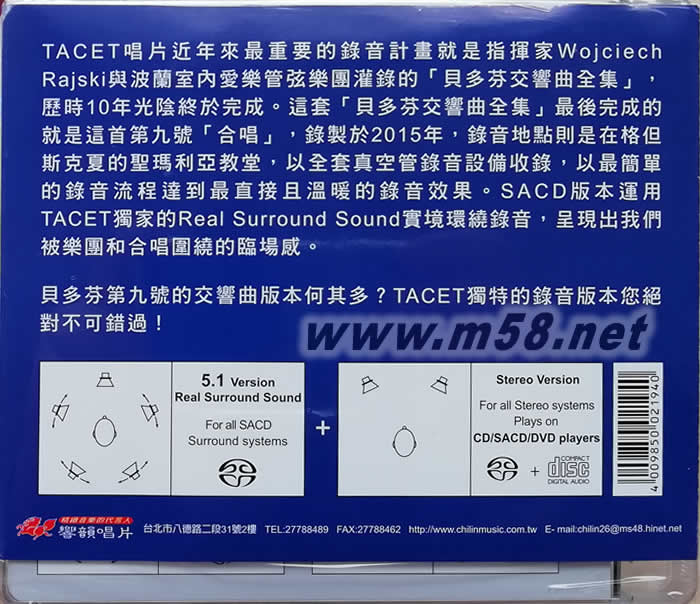 TACET唱片近年來最重要的錄音計畫就是指揮家Wojciech Rajski與波蘭室內愛樂管弦樂團灌錄的「貝多芬交響曲全集」,歷時10年光陰終於完成。這套「貝多芬交響曲全集」最后完成的就是這首第九號「合唱」,錄製於2015年,錄音地點則是在格但斯克夏的圣瑪利亞教堂,以全套真空管錄音設備收錄,以最簡單的錄音流程達到最直接且溫暖的錄音效果。SACD版本運用TACET獨家的Real Surround Sound實境環繞錄音,呈現出我們被樂團和合唱圍繞的臨場感。