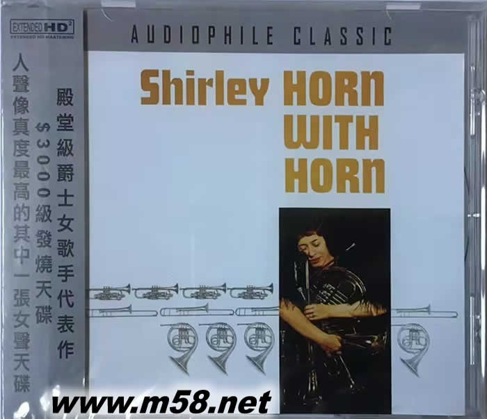 WITH HORN 殿堂級爵士女歌手(m58.net) 這是殿堂級爵士女歌手SHIRLEY HORN最受發燒友及爵士樂迷最喜愛的專輯,監製亦屬殿堂級的QUINCY JONES , 編曲除JONES外, 還有全部是大師級的THAD JONES, BILLY BYERS, DON SEBESKY, SHIRLEY HORN 對當今爵士天后DIANA KRALL 低沉輕柔唱腔的巨大影響在這張專輯清楚呈現.但說到歌聲嚃醖藏的韻味,徒弟還是及不上師父的。這張專輯最吸引發燒友之處是真實無論的人聲,曾出版過的CD版本原版音效一般,靚聲版是早已停業的DCC的版本,近年在ebay售價約為400美元,你手上這個AUDIOPHILE CLASSIC版和DCC的比較各有優點,但售價卻只是約三十份之一!