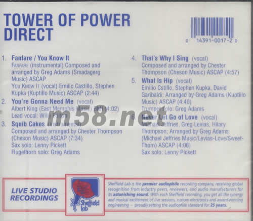 1.FANFARE /YOU KNOW IT FANFARE(INSTRUMENTAL)COMPOSED AND ARRANGED BY GREG ADMS (AMADAGERG MUSIC)ASCAP YOU KNOW LT (VOCAL)EMILIO CASTILLO,STEPHEN KUPKA(KUPTILLO MUSIC)ASCAP 2.YOU'RE CONNA NEED ME(VOCAL) ALBERT KING (EAST MEMPHIS MUSIC)BMI LEAD VOCAL:WILLY FULTON 3.SQUIB CAKES(INSTRUMENTAL) COMPOSED AND ARRANGED BY CHESTER THOMPSON(CHESON MUSIC)ASCAP SAX SOLO:LENY PICKETT FLUGEIHORN SOLO:GREG ADAMS 4.THAT'S WHY I SING(VOCAL) COMPOSEB AND ARRANGED BY CHESTER THOMPSON(CHESON MUSIC)ASCAP 5.WHAT IS HIP(VOCAL) EMILIO CSTILLO,STEPHEN KUPKA,DAVID GARIBALDI;ARRANGED BY GREG ADAMS(KUPTILLO MUSIC)ASCAP TRUMPET SOLO;GREG ADAMS 6.NEVER LET GO OF LOVE(VOCAL) MICHAEL JEFFRIES ,GREG LEVIAS,HILARY THOMPON;ARRANGED BY GREG ADAMS (MICHAEL JEFFRIES MUSIC/LEVIAS-LOVE/SWEET-THOM)ASCAP SAX SOLO;LENNY PICKETT