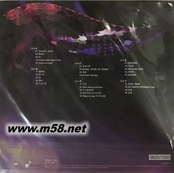SIDE A SIDE C SIDE E 1.. OVERTURE-BAND 1. 金色之夏 1. 葡萄成熟時 2. 畢加索 2. 第四晚心情/餓狼傳說 2. 月半彎 3. 滲 3. 香薰 3.MAN IN THE MIRROR 4 DREAM A LITTLE OF ME 4. SMOOTH OPERATOR 4. 快樂頌 5. CHEEK TO CHEEK 5 綠野聲蹤 SIDE B SIDE D SIDE F 1. 傻癡癡 1. 冬至 1. OUTRO-BAND 2. 愛不完 2. HOW DEEP IS YOUR LOVE 2. ALL I WANT FOR 3. 他 3. 分分鐘需要你 X’MAS IS YOU 4. 醒來 4. 最愛是誰(林子祥合唱) 3. 東風 5.人魚之歌 5. MAKE ME DAY(林子祥合唱) 4. 被窩