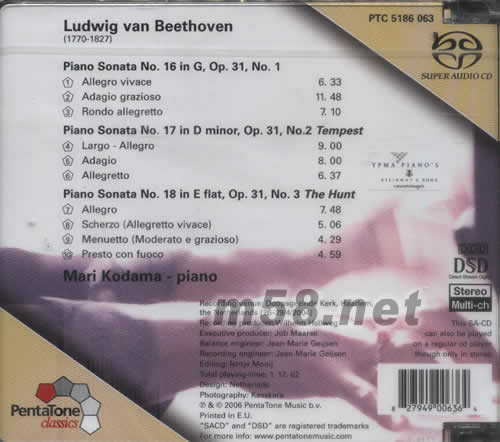 PIANO SONATA NO.16 IN G ,OP.31,NO.1 1.ALLEGRO VIVACE 2.ADAGIO GRAZIOSO 3.RONDO ALLEGRETTO PIANO SONATA NO.17 IN D MINOR,OP.31,NO.2 TEMPEST 4.LARGO-ALLEGRO 5.ADAGIO 6.ALLEGRETTO PIANO SONATA NO.18 IN E FLAT,OP.31,NO.3 THE HUNT 7.ALLEGRO 8.SCHERZO(ALLEGRETTO VIVACE) 9.MENUETTO(MODERATO E GRAZIOSO) 10.PRESTO CON FUOCO
