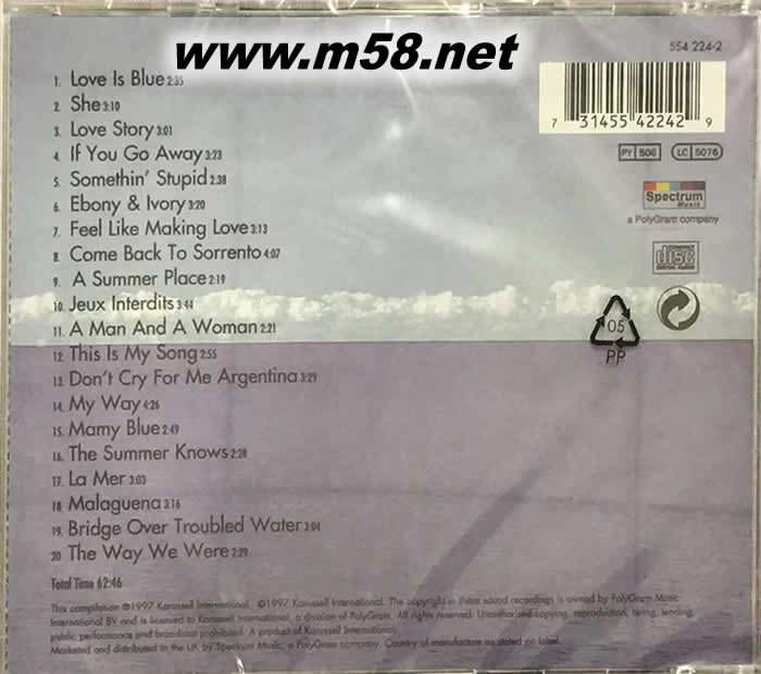 1. Love Is Blue 2. She 3. Love Story 4. Ne Me Quitte Pas (Version Orchestre PM) 5. Somethin' Stupid 6. Ebony And Ivory 7. Feel Like Makin' Love 8. Come Back To Sorrento 9. A Summer Place 10. Jeux Interdits Version 90 11. Un Homme Et Une Femme 12. This Is My Song Instrumental 13. Don't Cry For Me Argentina Album Version 14. My Way Comme D'Habitude 15. Mamy Blue 16. The Summer Knows 17. La Mer (2) 18. Malaguena 19. Bridge Over Troubled Water 20. The Way We Were