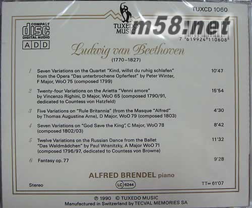 Variationen Für Klavier 鋼琴變奏曲(m58.net) 布蘭德爾(Alfred BRENDEL)鋼琴藝術(shù)4 貝多芬 本世紀(jì)維也納鋼琴學(xué)派最佳代表人物 琴藝絕佳,音樂(lè)感謝一流:精彩演繹貝多芬:現(xiàn)為英國(guó)國(guó)歌<天佑吾皇>。。5首主題曲變奏曲/紀(jì)想曲(OP。77) 立體聲錄音,瑞士原裝進(jìn)口