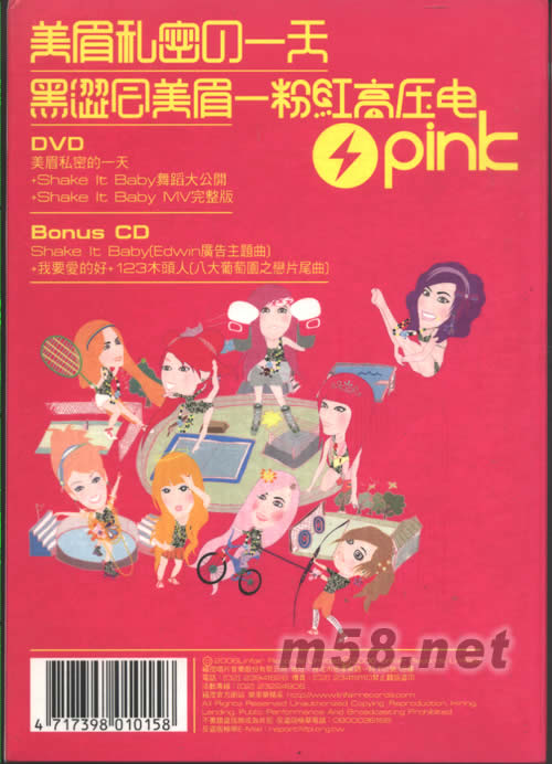粉紅高壓電(臺(tái)灣版)(m58.net) 隨碟附送52頁(yè)寫真 *黑澀會(huì)美眉最新專輯 『Shake It Baby』 95/12/15 福茂唱片全面戰(zhàn)斗發(fā)行* 【1套9款的美眉戰(zhàn)斗卡 預(yù)購(gòu)禮獨(dú)家珍藏】 美眉迷凡在95/12/1—95/12/13預(yù)購(gòu)期間搶先預(yù)購(gòu),立即獲得特別設(shè)計(jì)美眉精致Q版,1套9款的美眉戰(zhàn)斗卡,讓你一同加入美眉們的戰(zhàn)斗行列。 『粉紅高壓電』VS『甜心轟炸機(jī)』黑澀會(huì)美眉分組PK大對(duì)抗 上一張『美眉的私密日記影音DVD』拿下銷售的好成績(jī)后,這次為了讓每個(gè)美眉都更加努力,所以將她們分成兩組,設(shè)下難關(guān)讓她們才藝大PK!只是美眉們有九個(gè)人,怎么都沒(méi)辦法均分,難不成要把其中一個(gè)美眉切成兩半。 由大牙領(lǐng)軍,加上小蠻、鬼鬼、Apple及丫頭的『粉紅高壓電』,身高平均165公分。 另一組由Mei Mei帶隊(duì),成員有筱婕、小熏及彤彤的『甜心轟炸機(jī)』,個(gè)頭兒都比較嬌小,可是體重卻是『重量級(jí)』!