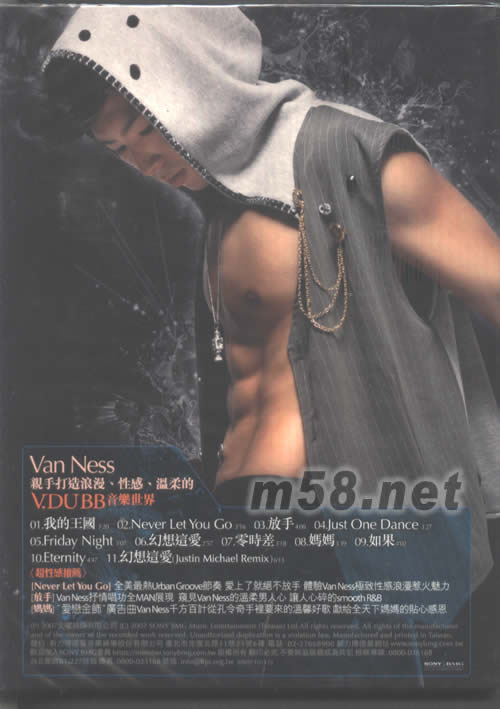 V.DUBB(臺灣酷爆版)(m58.net) 征服日韓風靡全亞洲 VAN NESS睽達5年最新個人專輯V.DUBB 雙重誘惑同時推出 [酷爆版]VS[窺視版] [酷爆版] 限量附贈: Van Ness貼身隨行悠游卡貼紙4張 [超性感推薦] [NEVER LET YOU GO]全美最熱URBAN GROOVE節奏 愛上了就絕不放手 體驗VAN NESS極致性感浪漫惹火魅力 [放手]VAN NESS 抒情唱功MAN展現窺見VAN NESS的溫柔男人心 讓人心碎的SMOOTH R&B [媽媽]"愛戀金飾"廣告曲VAN NESS千方百計從孔令奇手里要來的溫馨好歌獻給全天下媽媽的貼心感恩