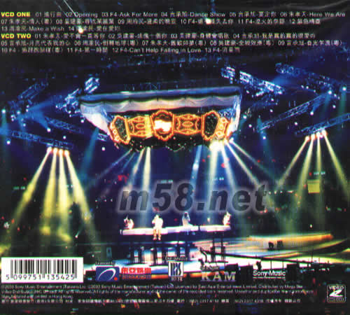 VCD ONE 01. 進行曲 02. Opening 03. F4-Ask For More 04. 言承旭-Dance Show 05. 言承旭-要定你 06. 朱孝天-Here We Are 07. 朱孝天-情人(粵) 08. 吳建豪-尋找朱麗葉 09. 周渝民-溫柔的晚安 10. F4-絕不能失去你 11. F4-煙火的季節 12. 紫色精靈 13. 周渝民-Make a Wish 14. 周渝民-愛在愛你 VCD TWO 01. 朱孝天-愛不會一直等你 02. 吳建豪-想像十個你 03. 吳建豪-身體會唱歌 04. 言承旭-我是真的真的很愛你 05. 言承旭-月亮代表我的心 06. 周渝民-倒轉地球(粵) 07. 朱孝天-舊歡如夢(粵) 08. 吳建豪-全城效應(粵) 09. 言承旭-春光乍洩(粵) 10. F4-追趕跑跳碰(粵) 11. F4-第一時間 12. F4-Can t Help Fall In Love 13. F4-流星雨