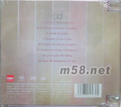 ROMANCE 吉它SACD(m58.net) MADE IN JAPAN 國(guó)際著名結(jié)他演奏家 XUE FEI YANG 加盟EMI首張發(fā)燒錄音大碟 ROMANCE DE AMOR 楊雪霏親自編寫(xiě)17首結(jié)他輕便樂(lè)譜 FEI與樂(lè)迷穿梭精湛演繹音樂(lè)世界 誠(chéng)意推介 西班牙結(jié)他名曲 ASTURIAS 柔情作品ROMANCE DE AMOR[藍(lán)色生死戀]主題曲 韓國(guó)電影[我的野蠻女友]主是曲I BELIEVE 電影主題曲CAVATINA,SCHINDLER‘S LIST結(jié)他版BEATLES名曲MICHELLE 權(quán)威樂(lè)評(píng)人一致激賞 [楊雪霏彈奏出來(lái)那種濃郁的音樂(lè)性和極速把你帶進(jìn)音樂(lè)意境的能力,完全是出乎我意料之外。]大草(音響技術(shù)) [才氣,靈氣,藝術(shù)氣質(zhì)逼人而來(lái)!]劉志剛(FI FI 音響)主編 [她的演奏不僅富有自信,也幾乎完美,無(wú)可置疑的有世界一流水準(zhǔn)。]魯進(jìn)(音響天地) [……青春,充滿活力,這樣的一位現(xiàn)代都巿女孩竟然彈奏出如此成熟而富陽(yáng)光氣息的結(jié)他音樂(lè),實(shí)在叫人感到驚訝……]CHARLIE MA (發(fā)燒音響)執(zhí)行編輯