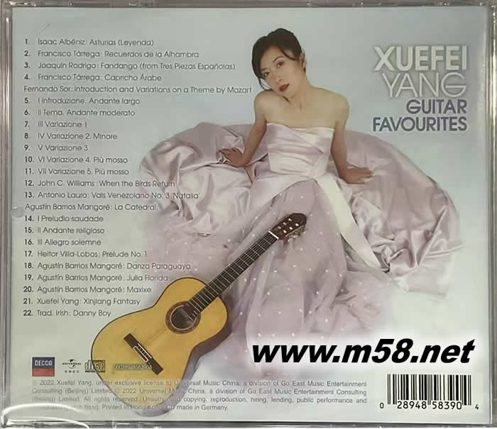 吉他摯愛 GUITAR FAVOURITES(m58.net) 這張專輯是古典吉他演奏家楊雪霏的錄音,收錄了她演奏的22首經(jīng)典作品,都是深受全世界樂迷喜愛的吉他佳作,每一首樂曲都是楊雪霏藝術(shù)道路中一路走來的的記憶點,而這些優(yōu)美動聽的旋律也清晰地串起了她的音樂旅程。從一位熱愛吉他的小女孩,成長為一位在世界舞臺表演的古典吉他演奏家。從孩童時期練習(xí)的作品,到在各國舞臺上被觀眾追捧的吉他經(jīng)典旋律,楊雪霏精心挑選的曲目橫跨了她30多年與吉他為伴的生活。專輯收錄了楊雪霏首次嘗試創(chuàng)作的《新疆幻想曲》,這是一首深受新疆民族音樂啟發(fā)而創(chuàng)作的極具西域風(fēng)格的吉他作品。此外,古典吉他大師、作曲家約翰·威廉姆斯的《當鳥兒回歸時》也由楊雪霏進行世界首錄。 楊雪霏說:“這些作品我從小到大在自己的音樂會上都彈過很多次,都是一些很受聽眾歡迎的作品,尤其是對于那些不彈吉他的普通觀眾,他們會覺得原來吉他還能彈成這樣,給他們留下印象特別深。我覺得有些作品只能在吉他這件樂器上彈,在別的樂器上演奏就沒有這種效果。這些作品可聽性很強,不僅是聽眾當然更是我自己非常喜歡的作品。還有,就是每首作品在我的音樂路程中有著特殊的紀念意義。” 楊雪霏回憶,自己14歲那年去西班牙、葡萄牙巡演,那件事情對于自己一生來說都是一個很重要的事件,因為那是她第一次去世界巡演,專輯中的《巴拉圭舞曲》就是那次巡演的曲目。那一次,楊雪霏還幸運的見到了西班牙國寶級的作曲家羅德里戈。“當時,我在馬德里演出的時候,并不知道他會來,那時候他已經(jīng)90多歲了。我記得當時還差幾分種快要上臺了,聽到翻譯說羅德里戈可能會來。正好我演奏他的曲子,當時非常緊張。羅德里戈是一個盲人作曲家,他看不到我,陪同他來的是他女兒。他女兒告訴他,這個表演者只有14歲,是一中國女孩。老人家就覺得特別驚訝,他以為是一個成年的職業(yè)演奏家。中場的時候,我有機會跟他握了手。我記得好多人問我說,你跟他握手跟他見面的時候是什么感覺,我說主要是很緊張。那是一個很特別的經(jīng)歷。” 那一次的旅行演出,楊雪霏不僅見到了傳說中的羅德里戈,而且也讓她大開眼界,也得到很多啟發(fā)。她說,就是從那一次開始,自己就有了想去歐洲學(xué)習(xí)的想法,“因為我覺得,歐洲的音樂以及文化歷史都很悠久,而且很豐富。”這張專輯選了羅德里戈的一個作品《Fandango》,這是她去英國留學(xué)之后最早的一首作品之一,這也是她學(xué)習(xí)過程中的一個記憶。 除了羅德里戈,還有一個人對楊雪霏有著很大影響,他就是吉他大師約翰·威廉姆斯。楊雪霏說,那是她在上中央音樂學(xué)院附中的時候,開始對人生和前途有所思考甚至焦慮,那一年威廉姆斯來京演出,她有幸在他的大師課上演奏了一首樂曲。因為這位音樂家的鼓勵與釋惑,讓她決心成為一位職業(yè)古典吉他演奏家。所以,在這行專輯中選擇了威廉姆斯的一首《當鳥兒回歸時》,這是她在威廉姆斯的個人網(wǎng)站上發(fā)現(xiàn)了曲目,覺得特別適合彈這種歌唱性的曲子。前不久,她遇到威廉姆斯,并把錄好的曲子發(fā)給他,他說他和他的家人都很喜歡自己彈的這首曲子,這個評價給了楊雪霏極大的鼓勵。 《Danny boy》是深受全世界樂迷喜歡的愛爾蘭歌曲,在愛爾蘭相當于“第二國歌”。和很多人一樣,楊雪霏也非常喜歡這個曲子。她還記得自己第一次去愛爾蘭,和一個長笛手合作演奏這首樂曲。她在練習(xí)的時候,旁邊有一個朋友聽著聽著眼淚都下來了。他給楊雪霏講了這首作品的背景,那種背井離鄉(xiāng)的悲傷,讓自己感受到他們本地人聽這首樂曲就像中國人聽“梁祝”一樣。以往楊雪菲都是與歌手合作,這一次她一人分飾兩角——她自己彈旋律,她自己彈伴奏。