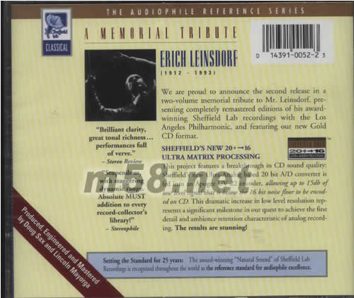 萊斯多夫 艾立下集THE SHEFFIELD LINSDORF SESSIONS(喇叭花24K金碟)(m58.net) 由萊恩斯朵夫(Erich Leinsdorf)指揮洛杉磯交響樂團演奏出廣受歡迎的曲目,包括普羅可菲夫的芭蕾組曲「羅密歐與朱麗葉」、德布西的「牧神的午后」序曲(以華格納的歌劇「Siegfried」第二幕「森林低語」。這些作品本身戲劇性強烈,加上萊恩斯朵夫刻意的讓樂團張顯其中的沖突及舞蹈韻律感,所以聽來十分過癮。最大的特色并非僅在音樂本身,這張1977年錄制于著名的加州米高梅錄音室的作品,乃TAS榜上名盤,喇叭花用最新科技將母帶加以處理翻為24K金碟,使CD能更完美的表現出原始母帶的細致質感。