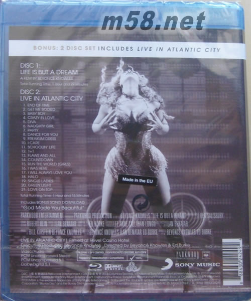 DISK 1 藍(lán)光BD 編號(hào) 曲名 試聽 1. Life Is But A Dream DISK 2 藍(lán)光BD 編號(hào) 曲名 試聽 1. Live In Atlantic City End Of Time 時(shí)間盡頭 2. Get Me Bodied 貼身共舞 3. Baby Boy 親愛男孩 4. Crazy In Love 瘋狂愛戀 5. Diva 玩美女神 6. Naughty Girl 淘氣女孩 7. Party 私人派對(duì) 8. Dance For You 為你起舞 9. Freakum Dress 魔力裙 10. I Care 只有我在乎 11. Schoolin` Life 學(xué)校生活 12. 1+1 1加1 13. Flaws And All 殘缺與全部 14. Countdown 倒數(shù) 15. Run The World (Girls) 女人我最大 16. I Was Here 存在過 17. I Will Always Love You 永遠(yuǎn)愛你 18. Halo 光環(huán) 19. Single Ladies 單身女郎 20. Green Light 綠燈 21. Love On Top 放在第一位的愛
