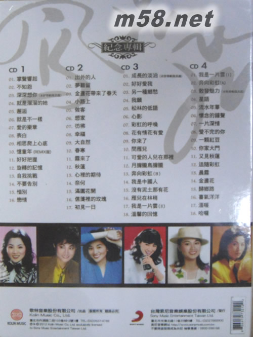 DISK 1 CD 1. 掌聲響起 2. 不知怨 3. 深深想你(未曾專輯發表過) 4. 就是溜溜的她 5. 邂逅 6. 就是不一樣 7. 愛的樂章 8. 表白 9. 相思爬上心底 10. 憶童年(REMIX版) 11. 好好把握 12. 旋轉的記憶 13. 自我挑戰 14. 不要告別 15. 惜別 16. 戀情 DISK 2 CD 1. 出外的人 2. 夢難留 3. 金盞花帶來了春天 4. 小路上 5. 做客 6. 想家 7. 彷彿 8. 幸福 9. 大自然 10. 春寒 11. 霧來了 12. 秋蓮 13. 心里的期待 14. 奈何 15. 滿園花開 16. 信箋里的玫瑰 17. 初見一日 DISK 3 CD 1. 成長的淡泊(未曾專輯發表過) 2. 好好愛我 3. 另一種鄉愁 4. 我愿 5. 松林的低語 6. 心影 7. 彩虹的呼喚 8. 花有情花有愛 9. 你來了 10. 問雁兒 11. 可愛的人兒在那里 12. 月朦朧鳥朦朧 13. 奔向彩虹(B) 14. 我是中國人 15. 沒有泥土那有花 16. 雁兒在林梢 17. 我是一片云(II) 18. 溫馨的回憶 DISK 4 CD 1. 我是一片云(I) 2. 奔向彩虹(A) 3. 散發魅力(未曾專輯發表過) 4. 星語 5. 流水年華 6. 懷念的鐘聲 7. 一片深情 8. 愛不完的你 9. 一顆紅豆 10. 你家大門 11. 又見秋蓮 12. 追隨彩虹 13. 晨霧 14. 金盞花 15. 歸鄉路 16. 喜氣洋洋 17. 溫暖 18. 哈囉