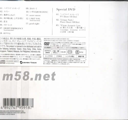 DISC 1 1. Hi-Fi Message 2. 小黑魚 3. 等風(fēng)的心情 4. 泣雨的夜裡,給你的淚滴 5. 戀文 6. 緋紅 7. SWEET EMERGENCY(Instrumental) 8. 明日的心 9. 你的 手 10. 都是浪漫 11. azure moon 藍月 12. I MET YOU(Instrumental) 13. good night DISC 2 1. 「Hi-Fi Message」音樂錄影帶拍攝花絮 2. 「清新小事樂園」專輯封面拍攝花絮 3. 「X'mas Acoustic Live at 浦上天主堂 ~愛的謳歌~」1.nostalgia 鄉(xiāng)愁 2.water(s) 3.愛情的天氣 4.五月雨 5.愛的謳歌