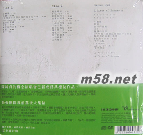 夏季練習(xí)曲世界巡回現(xiàn)場錄音(臺灣預(yù)購版)(m58.net) 陳綺貞 A Piece of Summer II 夏季練習(xí)曲世界巡迴現(xiàn)場錄音 屬于你的一片夏天 限量精裝2CD加贈夏季影音DVD(約80分鐘) 當(dāng)她開口,世界就安靜了下來。 夏天 要聽陳綺貞。 在音樂與光影的大雨里,傾盆釋放妳關(guān)于愛,自由,夏天的回憶。 即使有恐懼,也要更真實(shí)、更徹底地活。 限量贈品:夏季練習(xí)曲珍藏海報一張。