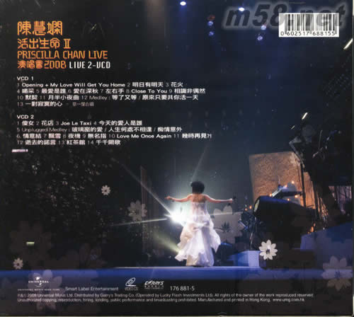 VCD 1 01. Opening + My Love Will Get You Home 02. 明日有明天 03. 花火 04. 喝彩 05. 最愛是誰(shuí) 06. 愛在深秋 07. 左右手 08. Close To You 09. 相識(shí)非偶然 10. 默契 11. 月半小夜曲 12. Medley:等了又等/原來(lái)只要共你活一天 13. 一對(duì)寂寞的心 -蔡一杰合唱 VCD 2 01. 傻女 02. 花店 03. Joe Le Taxi 04. 今天的愛人是誰(shuí) 05. Unplugged Medley:玻璃窗的愛/人生何處不相逢/癡情意外 06. 情意結(jié) 07. 飄雪 08. 夜機(jī) 09. 無(wú)名指 10. Love Me Once Again 11. 幾時(shí)再見?! 12. 逝去的諾言 13. 紅茶館 14. 千千闕歌