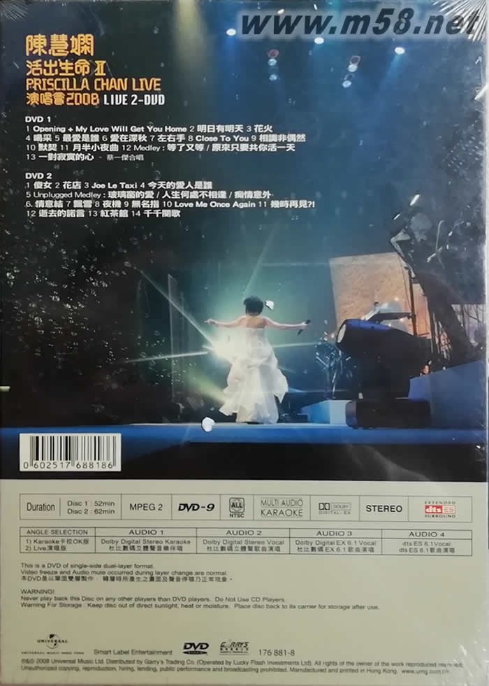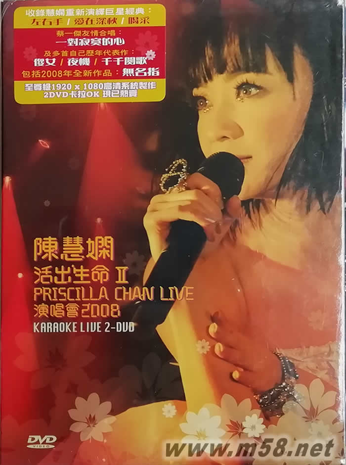 活出生命 II 演唱會2008 LIVE KARAOKE 2DVD(m58.net) 收錄慧嫻重新演繹巨星經(jīng)典:左右手/愛在深秋/喝彩 蔡一杰友情合唱: 一對寂寞的心 及多首自己歷年代表作: 傻女/夜機(jī)/千千闕歌 包括2008年全新作品:無名指 至尊級1920*1080高清系統(tǒng)制作 2DVD卡拉OK現(xiàn)已熱賣