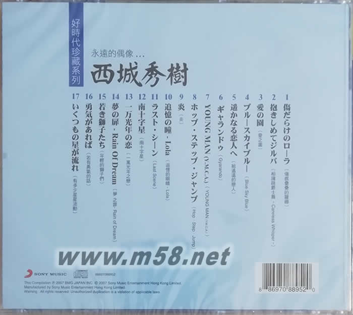西城秀樹(2018紀念專輯)(m58.net) 永遠懷念上月逝世之日本藝能界頭號偶像西城秀樹 特別誠意再度推出 永遠的偶像…西城秀樹 輯錄17首紅極一時之精彩歌曲包括: Young Man(改編自Y.M.C.A.), Blue Sky Blue(羅文<好歌獻給您>原曲) 相擁跳爵士舞~改編自Careless Whisper~,追憶的眼睛-Lola(張國榮<愛慕>原曲) ,及 愛之園(區瑞強<愛之園>原曲)等等… 內附中/日對照歌詞