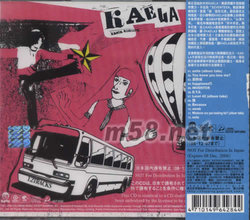 KAELA同名專(zhuān)輯(m58.net) 英日濕血的木村KAELA,兼具亮麗外型與創(chuàng)作實(shí)力,不但為[SEVENTEEN]雜志專(zhuān)屬模特兒,更是[新 堂本兄弟]節(jié)目固定主持班底.從小學(xué)琴的KAELA在音樂(lè)上的表現(xiàn)令名界折服,由SMAP金牌制作人[山澤大洋]\椎名林檎御用吉他手[鈴木玲史]聯(lián)手打造,加上KAELA風(fēng)格獨(dú)具的個(gè)性化作詞與演唱,讓專(zhuān)輯甫推出,即登上日本公信榜第八位!之后名方的廣告邀約蜂擁而至,汽車(chē)\護(hù)唇膏\手機(jī)通訊等,親自拍攝加上演唱廣告曲,讓KAELA成為炙手可熱的代言人.