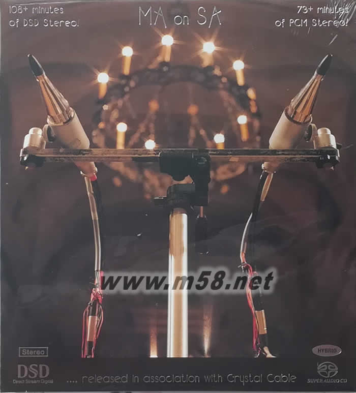 MA ON SA 三小時(shí)美妙音樂(lè)旅程 絕對(duì)精選 SACD 劉漢盛推介(m58.net) 這一張專輯是MA公司的“超長(zhǎng)時(shí)間的超精選”。專輯總共三小時(shí)(SACD層收錄19首曲子,CD層收錄13首曲子,曲目完全不同),所以專輯里面從古樂(lè)到現(xiàn)代音樂(lè);從民謠到地方傳統(tǒng)樂(lè)曲;從琵琶獨(dú)奏到鋼琴三重奏;演奏者從中國(guó)人、西班牙人到以色列人。包羅萬(wàn)象,但有一點(diǎn)可以肯定的是都好聽(tīng)而且錄音奇佳。 本專輯的特色在于錄音動(dòng)態(tài)范圍寬幅強(qiáng)大。專輯封面的麥克風(fēng),應(yīng)是經(jīng)過(guò)MA公司自行DIY修改過(guò)的,使音樂(lè)聽(tīng)起來(lái)非常活生。 除了動(dòng)態(tài)驚人之外,每一首曲子所呈現(xiàn)的樂(lè)器演奏質(zhì)感也都非常棒,音質(zhì)甜美,音色明亮富有光澤,尤其是各種奇特的撥弦樂(lè)器與打擊樂(lè)器,讓您聽(tīng)來(lái)興奮異常。
