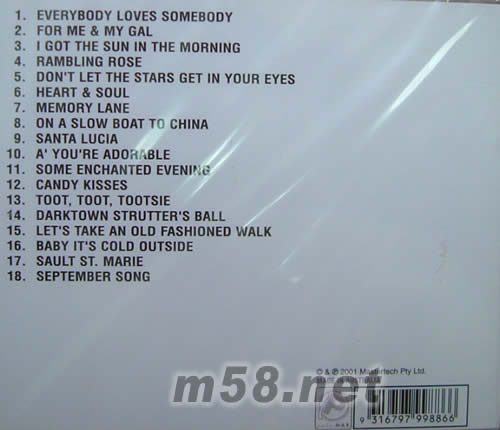 1.EVERYBODY LOVES SOMEBODY 2.FOR ME & MY GAL 3.I GOT THE SUN IN THE MORNING 4.RAMBLING ROSE 5.DON'T LET THE STARS GET IN YOUR EYES 6.HEART & SOUL 7.MEMORY LANE 8.ON A SLOW BOAT TO CHINA 9.SANTA LUCLA 10.A'YOU 'RE ADDRABLE 11.SOME ENCHANTED EVENINQ 12.CANDY KISSES 13.TOOT ,TOOT,TOOTSIE 14.DARKTOWN STRUTTER'S BALL 15.LET'S TAKE AN OLD FASHIONED WALK 16.BABY IT'S COLD OUTSIDE 17.SAULT ST.MARIE 18.SEPTEMBER SONG