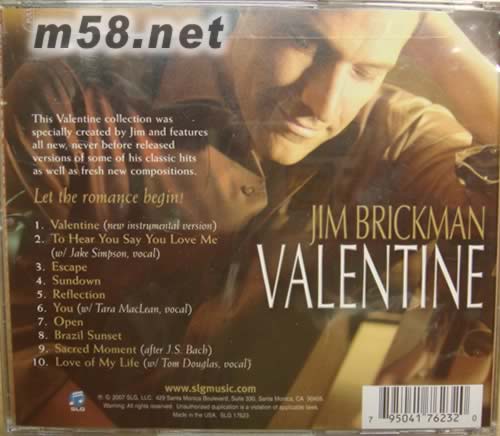 情人心曲VALENTINE(m58.net) 美國鋼琴名家 Jim brickman 情人節特備專輯 演繹多首深情作品 唯美的鋼琴旋律中 一聽鐘情 深情的歌聲 動人的情懷暖人心窩 原裝美國版頂級錄制 音色通透靚絕