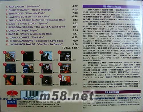天籟之聲 新錄音精華大全 臺灣版(m58.net) 音樂與演出: 當燭光微明,將音響轉開,退去緊繃的鞋,放鬆你的心情,此時正是最高鑑賞品味的您進入音樂涅盤境界的最佳時刻。為了讓您身心進入最佳狀況,Chesky特別自其近年最暢銷的錄音中,挑選了十二首歷經焠鏈的絕妙樂曲,配合其一貫精良超絕的錄音效果,讓您輕鬆進入全然無礙的爵士樂與流行音樂天地。 專輯選錄了Chesky旗下最頂尖的藝人之最原創的經典錄音,包括了莎拉.K(Sara K.)以溫暖的嗓音唱出了令人砰然心動的”What’s A Little More Rain”、安娜.卡蘭(Ana Caram)慰撫般的溫柔低語唱出了令人讚嘆的”Sonhando”,堪稱是bossa nova音樂的又一經典、李文思頓.泰勒(Livingston Taylor)以獨具魅力的嗓音演唱”Our Turn To Dance”,以及恰克.曼裘尼(Chuck Mangione)散發迷人光芒的”Consuelo’s Love Theme”,而蕾貝卡.碧瑾(Rebecca Pidgeon)的暢銷專輯「紐約女子俱樂部」中的”The Word Around Town”也是不可錯過的代表作。其中最精采的部份當屬獲得葛萊美獎提名的,由瓊恩.法狄斯(Jon Faddis)奏出了如開水一般逐漸沸騰昂揚的管弦樂間奏曲”Riverside Park”,以及被稱為「沙發爵士」(lounge jazz)的專輯「爵士語錄」”Dave’s True Story”中的”Spasm”,是一首洋溢著輕鬆節奏的新創樂曲。 其他還包括了轉化以現代編曲演奏Thelonius Monk的爵士經典名曲”Round Midnight”,克莉絲蒂.貝倫(Christy Baron)為此曲帶出了陰鬱的藍調氣氛,卻不乏個人獨特的風韻。約翰.貝西爾四重奏(John Basile)演奏出了值得全心擁抱,由保羅.戴斯蒙(Paul Desmond)所創作的”Desmond Blue”。而Laverne Butler演唱的”Isn’t It A Pity”則自心碎的感覺中搖擺出甜蜜的歡愉。 收錄十二首Chesky近年最暢銷的錄音中歷經焠鏈的絕妙樂曲,一貫精良超絕的錄音效果讓您輕鬆進入全然無礙的爵士樂與流行音樂天地。以96kHz-24bit技術錄製,並加以Chesky獨門的技術加以剪輯處理,是對於想要一窺Chesky錄音寶藏的您,讓您輕鬆進入全然無礙的爵士樂與流行音樂天地,絕對是不可錯過的一張精選輯。 錄音監賞: 專輯雖是精選輯,每一首樂曲的錄音各具特色,但卻也再次證明Chesky錄製的每一樂曲都足堪為錄音典范,俱為音響測試之最高標準。收錄的錄音包括了Chesky一向引以為傲的「128倍超頻取樣」(128 x Oversampling)高解析度的錄音技術,以及近期錄音工業標竿的96kHz-24bit技術,兩者都同時提供樂迷們鑑賞Chesky音樂與錄音效果的絕佳范例。