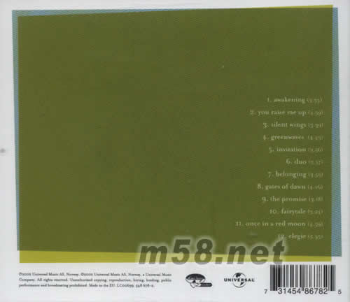 1. Awakening 2. You Raise Me Up 3. Silent Wings 4. Greenwaves 5. Invitation 6. Duo 7. Belonging 8. Gates Of Dawn 9. The Promise 10. Fairytale 11. Once In A Red Moon 12. Elegie