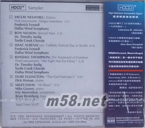 HDCD SAMPLER 示范天碟第一輯 HIGH DEFINTION COMPATIBLE DIGITAL(m58.net) 《RR HDCD示范天碟第一輯》是美國(guó)著名發(fā)燒錄音品牌RR在1992年發(fā)行的第一張HDCD效果示范碟,收入了以該技術(shù)制作的6段爆棚錄音。RR這家成立于1976年的唱片公司從誕生之日起就以高保真的聲音還原效果為訴求,并在CD唱片音質(zhì)改良方面做出了很大的努力。 1992年他們推出的“HDCD數(shù)碼錄音技術(shù)”無(wú)疑是RR最杰出的成就之一。HDCD的全稱(chēng)“High Definition Compatible Digital”直譯為“高清晰度CD”,它以傳統(tǒng)CD唱片為載體,提高了錄音回放的清晰度、層次感、空間感以及動(dòng)態(tài)、定位等諸多方面,迅速被業(yè)界所認(rèn)可。而在擁有HDCD解碼芯片的唱機(jī)上,這些提升則更為明顯!如今HDCD已經(jīng)通過(guò)技術(shù)授權(quán)而被業(yè)界諸多唱片公司所廣泛采用。