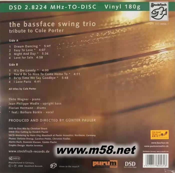 比費斯搖擺三重奏向波特致敬 The Bassface Swing Trio 黑膠(m58.net) Thilo Wagner (鋼琴) Jean-Philippe Wadle (低音大提琴) Florian Hermann (鼓) feat. Bruno Müller (結(jié)他) 德國重量級爵士三重奏組合比費斯搖擺三重奏攜手?jǐn)z人魅力的嗓音的爵士女歌唱家巴巴拉.布克萊,向美國著名百老匯音樂劇作曲家波特(Cole Porter)致敬專輯,重新演繹波特多首音樂劇及爵士樂佳作,這個嶄新組合帶給您一個意想不到的爵士之旅。180克直刻黑膠。 瓦格納的鋼琴演奏音色清純而豐富,盈亮溫暖,透徹分明。瓦德爾的低音大提琴如影隨形般的拉奏,恰如其份地相伴。赫爾曼節(jié)奏精準(zhǔn),美妙動聽的擊鼓配合這次被誠邀客串演出的國際知名結(jié)他手布魯諾‧穆勒(Bruno Müller)活潑明朗,清麗簡潔的彈奏,整合成難以抗拒的美樂,加上精湛的錄音技術(shù),盡顯搖擺爵士樂引人入勝之處。